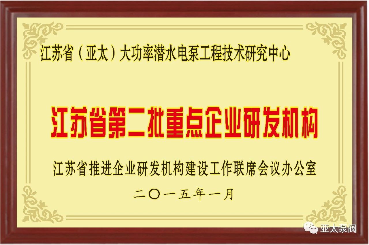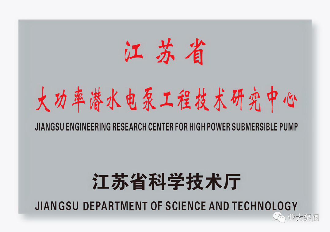 亞太泵閥有限公司是專業(yè)從事大功率潛水電泵及泵站系統(tǒng)研究的國(guó)家高新技術(shù)企業(yè),企業(yè)先后獲批國(guó)家博士后科研工作站、江蘇省企業(yè)技術(shù)中 心、江蘇省大功率潛水電泵工程技術(shù)研究中心、江蘇省研究生工作站等省級(jí)平臺(tái),技術(shù)創(chuàng)新能力顯著增強(qiáng),先后獲得國(guó)家科技二等獎(jiǎng)1項(xiàng)、省部級(jí)科技進(jìn)步獎(jiǎng)12項(xiàng)、承擔(dān)國(guó)家和省級(jí)研發(fā)項(xiàng)目11項(xiàng)、主持和參與制訂國(guó)家和行業(yè)標(biāo)準(zhǔn)8項(xiàng)。此次成功獲批省特大型潛水電泵及泵站系統(tǒng)工程研究中心,成為亞太泵閥第5個(gè)省級(jí)以上研發(fā)平臺(tái)。